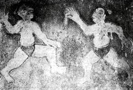 1) The tomb murals (circa 37BC) of the Koguryo Kingdom (now Southern Manchuria and North Korea) depicting two youths engaged in martial art free sparring stances;